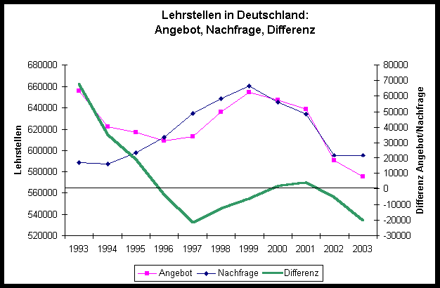 Wann immer der Unterschiedsbetrag zwischen angebotenen und nachgefragten Lehrstellen ins Minus rutscht, wird in der Öffentlichkeit der Ruf nach Einführung einer Ausbildungsplatzabgabe laut. Bei einer Situation wie der jetzigen (s. Grafik), noch dazu bei einer rot-grünen Regierungskoalition, muss mit dem Schlimmsten gerechnet werden. Das Schlimmste wäre eine baldige gesetzliche Regelung unter Umgehung der Zustimmung des Bundesrats, die nahezu ausschließlich dazu dient, die bei der Agenda 2010 zu kurz gekommenen Parteiflügel ohne jegliche ordnungspolitische Vernunft zu besänftigen.
