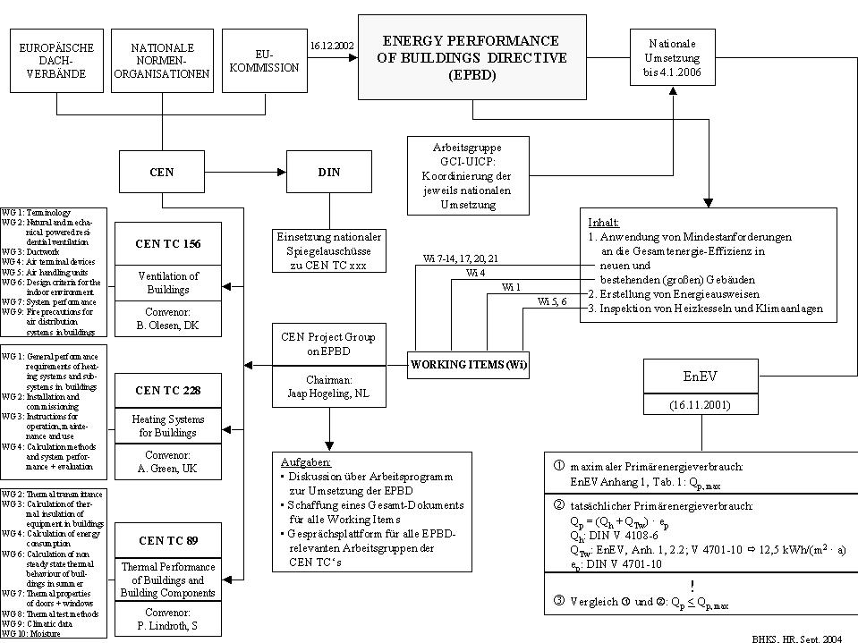 Unter allen großformatigen Veränderungen, die auf den Wirtschaftszweig Gebäudetechnik in absehbarer Zeit zukommen, ist es die Gesamtenergieeffizienz-Richtlinie der Europäischen Kommission (im folgenden kurz: Effizienz-Richtlinie), die die Menschen und ihre Köpfe am meisten durcheinander wirbelt. Die Verflechtungen von Verordnungen, Normen und sonstigen Vorschriften im unmittelbaren und weiteren Umfeld der Richtlinie sind so filigran, dass es selbst ansonsten guten Kennern des Faches schwer fällt, den Überblick zu behalten. Am 16. Dezember 2002 haben das Europäische Parlament und der Rat der Europäischen Union auf Vorschlag der Europäischen Kommission eine Richtlinie über die Gesamtenergieeffizienz von Gebäuden im Amtsblatt der Europäischen Gemeinschaften veröffentlicht. Sie ist am gleichen Tage in Kraft getreten. Ihr erklärtes Ziel ist es, die Gesamtenergieeffizienz von Gebäuden (energy performance of buildings) in den Ländern der Europäischen Union zu verbessern. Dabei sollen ganz ausdrücklich - Art. 1 der Richtlinie - die jeweiligen äußeren klimatischen und lokalen Bedingungen sowie die Anforderungen an das Innenraumklima und die Kostenwirksamkeit Berücksichtigung finden. Politischer Hintergrund sind die Verpflichtungen, die die Europäische Union im Kyoto-Protokoll eingegangen ist, um mitzuhelfen, die Kohlendioxid-Emissionen weltweit zu vermindern. Nationale Umsetzung bis Januar 2006 In der Richtlinie wird den Mitgliedsstaaten auferlegt, die teilweise sehr allgemein gehaltenen Vorschriften bis zum 4. Januar 2006 durch geeignete Rechts- und Verwaltungsvorschriften jeweils national umzusetzen. Für einige - nicht alle! - ihrer Vorgaben besteht die Möglichkeit, eine Verlängerung der nationalen Umsetzung um bis zu drei Jahre in Anspruch zu nehmen. Auf den knappst möglichen Raum kondensiert ist der wesentliche Inhalt der Richtlinie in drei Anforderungen zu beschreiben: 1. der Anwendung von Mindestanforderungen an die Gesamtenergie-Effizienz von Gebäuden, 2. die Erstellung von Energieausweisen, 3. die Einführung von Maßnahmen zur Inspektion von Heizkesseln und Klimaanlagen. Zwar lässt die Richtlinie in sich bereits breiten Raum für jeweils unterschiedliche nationale Umsetzungsmaßnahmen, z.B. bei der Inspektion von Heizkesseln (Artikel 8) oder der Benennung von unabhängigem Fachpersonal (Artikel 10) für die Erstellung von Energieausweisen und die Inspektion von Heizkesseln und Klimaanlagen, aber insgesamt macht eine europäische Richtlinie nur dann Sinn, wenn gleiche Ziele mit Maßnahmen, die im wesentlichen zu gleichen Ergebnissen führen, angestrebt werden. Dies ist jedoch genau der Punkt, an dem sich die Geister bereits zu scheiden beginnen. Der europäische "Harmonisierungsstrang" Auf der einen Seite gibt es den europäischen "Harmonisierungsstrang". Darunter sind diejenigen europäischen Einrichtungen zu verstehen, deren Trachten und Streben auf eine möglichst einheitliche Umsetzung in allen Ländern der Europäischen Union, von nationalen Besonderheiten abgesehen, gerichtet ist. Auf diesem Feld spielen die europäischen Normungsorganisationen CENELEC (für den Bereich der Elektrotechnik) und CEN (für den großen Rest) eine tragende Rolle. Um bei der Gebäudetechnik im konventionellen Sinne zu bleiben: führende Experten ihres Faches und ihres Landes dachten bei CEN schon lange vor dem Erlass der Effizienz-Richtlinie über Sachverhalte nach, die länderübergreifend genormt werden könnten. Beispielhaft seien die Technischen Kommissionen (TC's) 156 (Lüftung von Gebäuden), 228 (Heizsysteme für Gebäude) und 89 (Wärmeschutz von Gebäuden und Bauteilen) genannt (s. Tab. 1). Allein aus den Arbeiten der Experten im CEN TC 89 sind bis jetzt ca. 120 europäische Normen hervorgegangen. Mit Erlass der Effizienz-Richtlinie stellten sich an die bereits existierenden CEN-TC's neue Anforderungen. Die teilweise nebulös gehaltenen Vorstellungen der Verfasser der Effizienz-Richtlinie mussten in präzise Zieldefinitionen und, dem folgend, wohl gegeneinander abgegrenzte Arbeitsschritte (working items) zur Erreichung der Zieldefinitionen übersetzt werden. Da die aus den Zieldefinitionen folgenden Arbeitsschritte mehrere der vorhandenen Arbeitsgruppen (working groups) hätten betreffen können und damit Überschneidungen und Doppelarbeiten vorprogrammiert gewesen wären, setzte das CEN eine besondere Projektgruppe ein, die die einzelnen Anforderungen der Effizienz-Richtlinie bis auf die Arbeitsebene hinab koordinieren soll. Zum Vorsitzenden dieser Projektgruppe wurde der Niederländer Jaap Hogeling, ein in seinem Land hoch respektierter Mann, berufen. Nationale Schiene läuft parallel Neben diesem europäischen "Harmonisierungsstrang" läuft zeitlich parallel eine jeweils von nationalen Gesichtspunkten dominierte zweite Schiene mit mindestens gleicher Verve. Nehmen wir das Beispiel Deutschlands. Im so zu sagen vorauseilenden Gehorsam wurde eine Reihe von Gesichtspunkten der Effizienz-Richtlinie in einer Energieeinspar-Verordnung vom 16. November 2001 implementiert. Sie bleibt jedoch insofern hinter der Effizienz-Richtlinie zurück, als sie eben nicht die gesamte Energie-Effizienz eines Gebäudes, sondern lediglich Teile davon zu bewerten in der Lage war: die hierfür erforderlichen Normen sind einerseits für einzelne Teile der Anlagentechnik und andererseits für bestehende bzw. neue Gebäude, von Ausnahmefällen ohnehin abgesehen, bis zum heutigen Tage nicht vorhanden (s. Tab. 2, Verfasser: Dipl.-Ing. Uwe Fröhlich, BHKS). Dieser Mangel könnte durch die laufenden Arbeiten an der vom Bundesbauministerium initiierten DIN 18599 (Obmann: Dipl.-Ing. Erhorn, Stuttgart) behoben werden. Sie ist gedacht als eine - wohlgemerkt: deutsche - Norm, mit der, so sie zustande käme, alle bisherigen nationalen Normen für den Neubau und den Gebäudebestand obsolet würden. Deutsche Lösungen für die Katz? Und nun kommt das Problem: wie kann sicher gestellt werden, dass erstens di